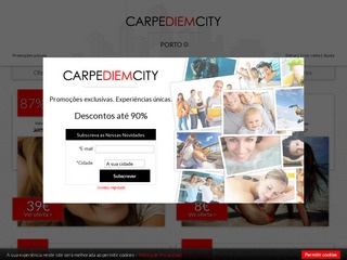 Descobre a tua Cidade com descontos até 90%! Vê a tua cidade de uma perspetiva diferente com a CarpeDiemCity! Novos e diversos descontos todos os dias em restaurantes, lazer, spa, beleza e desporto, emoção garantida por menos, até 90%! Imagina a sensação de relaxamento e bem-estar de um dia de spa, ou um jantar com quatro pratos por menos de metade do preço. A experiência CarpeDiemCity só é possível quando um número mínimo de pessoas compra o desconto.